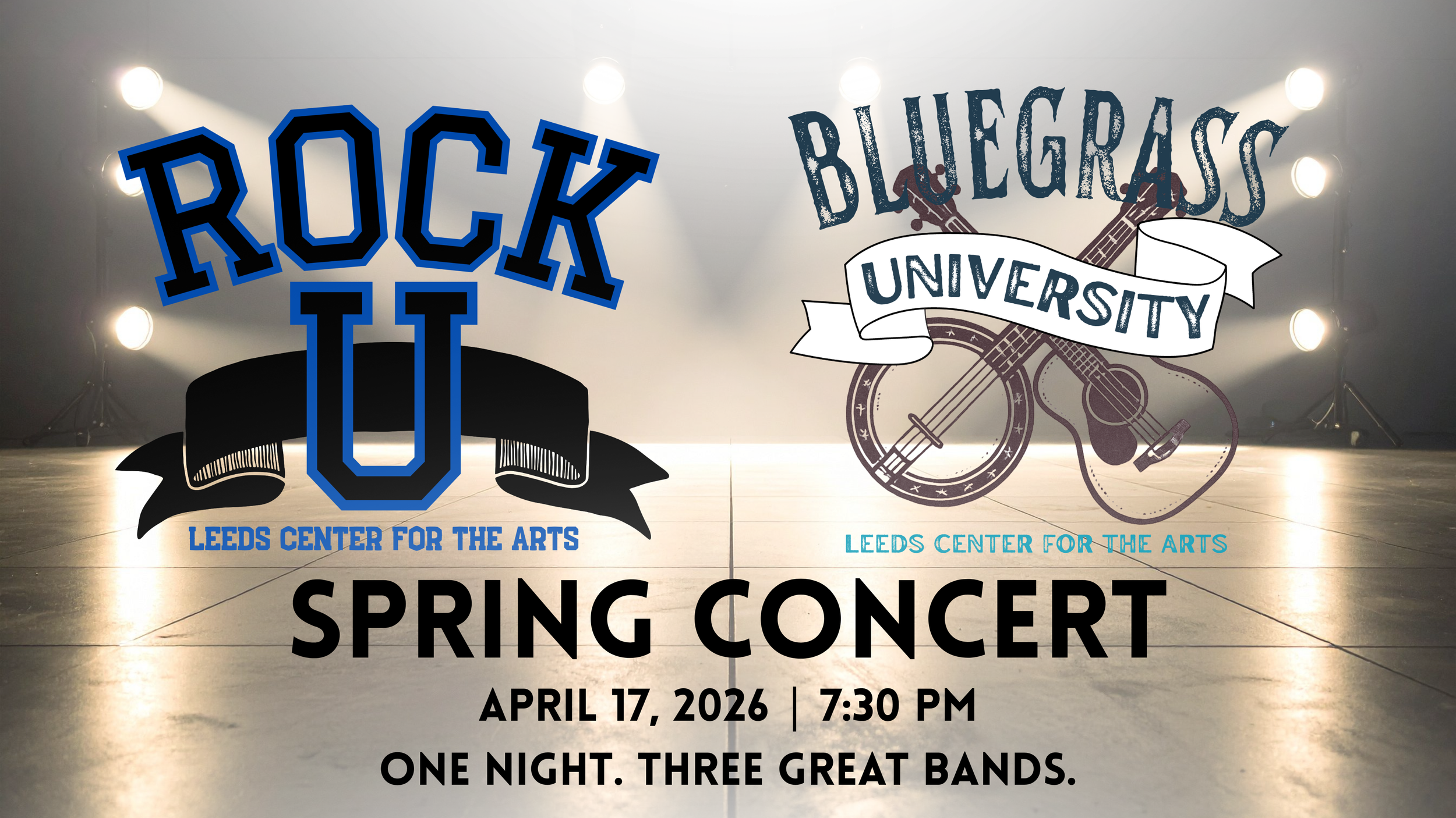 Back to All Events Rock U and Bluegrass U Concert Friday, April 17, 2026 7:30 PM 9:00 PM Google Calendar ICS Join us for an evening of great music from three of our educational bands - Rock University and Bluegrass University. This concert is free and open to the public!